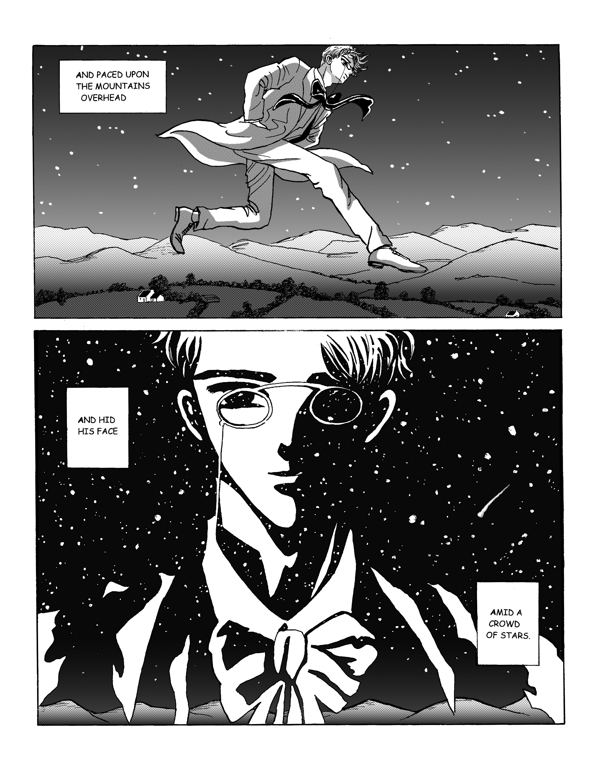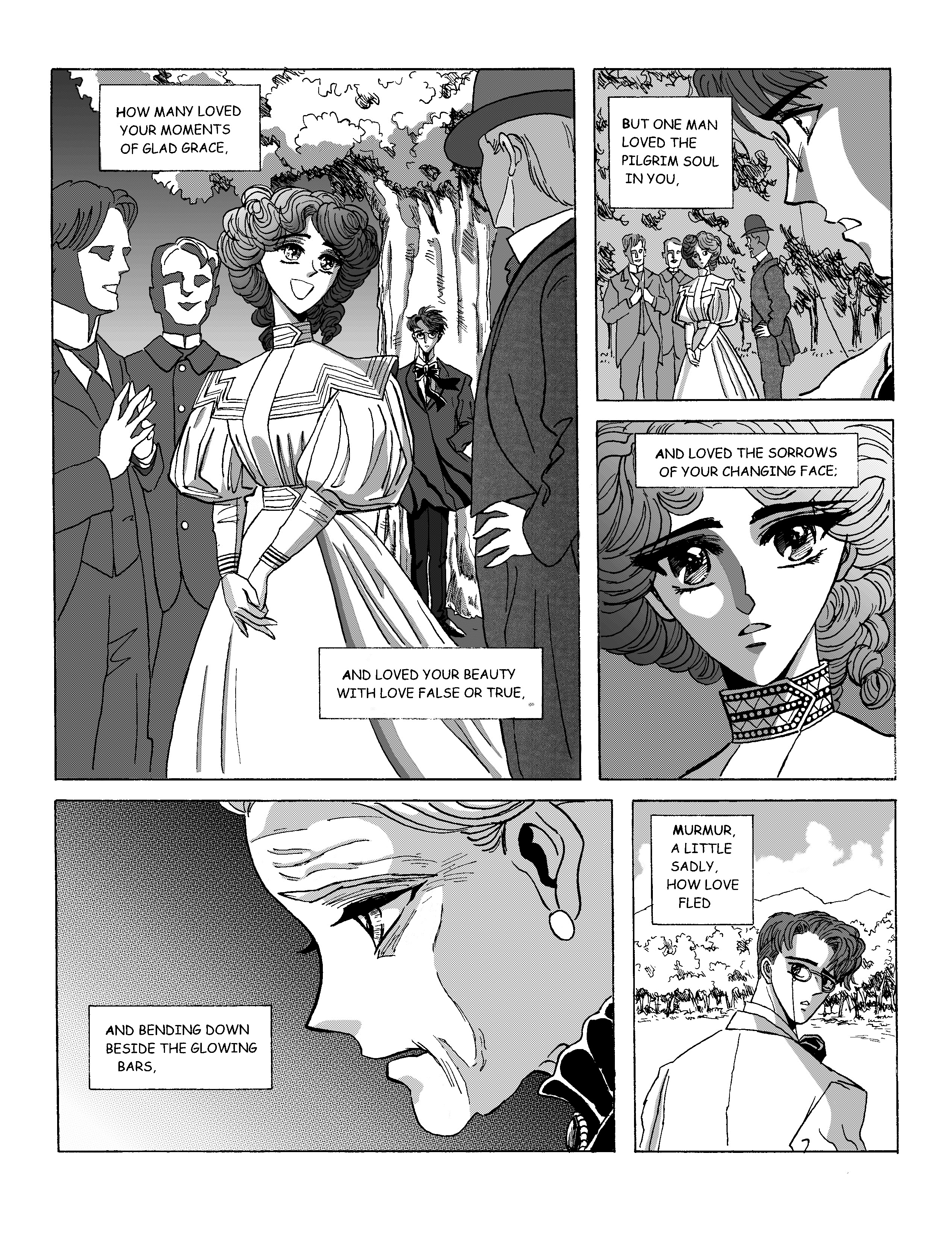 My adaptation of Yeats’ 1893 poem, done in the manner of a Japanese manga. The style is a tribute to the beautiful Shojo manga (girls’ comics) created by the “Clamp” collective in the early 90s. The manga-style screentones are by the illustrator and artist Maryse Daniel. Click on images to enlarge.