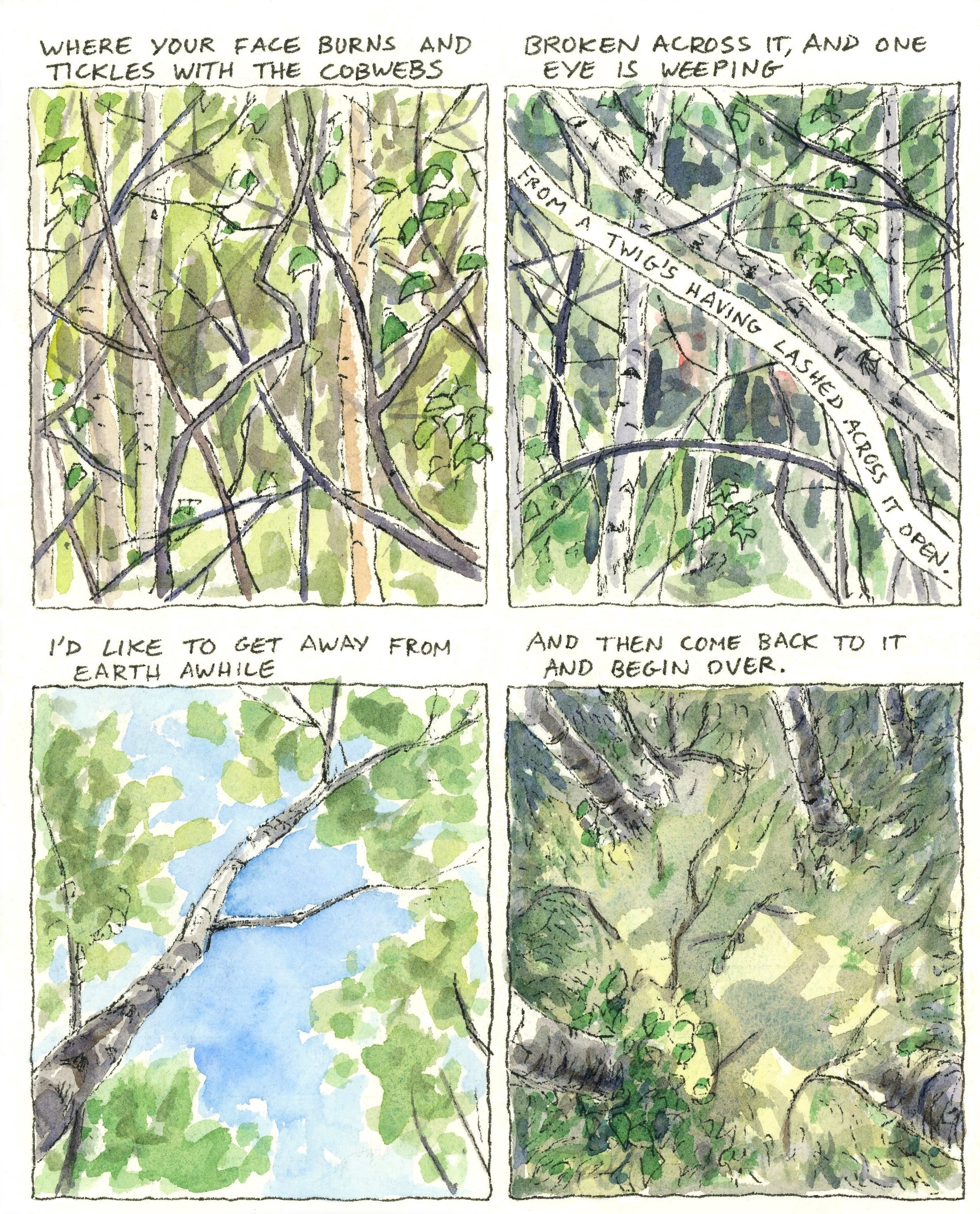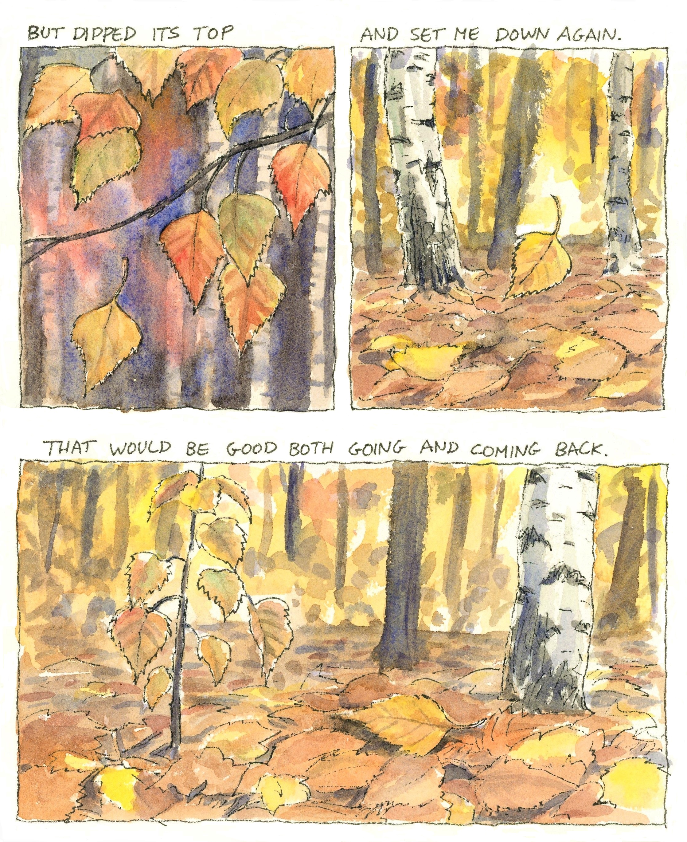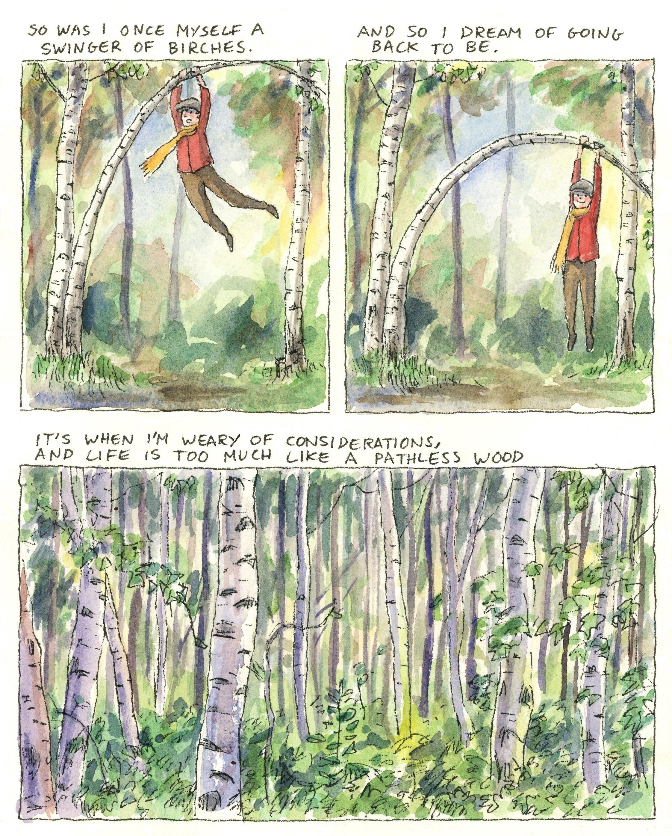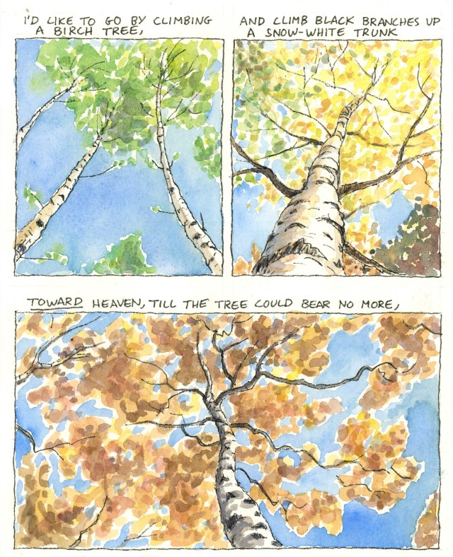 Here is my comics adaptation of a section of the poem “Birches” by Robert Frost (written in 1913-14). This comic was commissioned by and originally appeared in the American magazine Plough Quarterly: http://www.plough.com/en